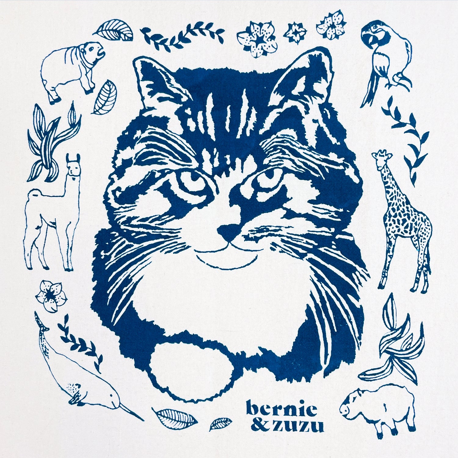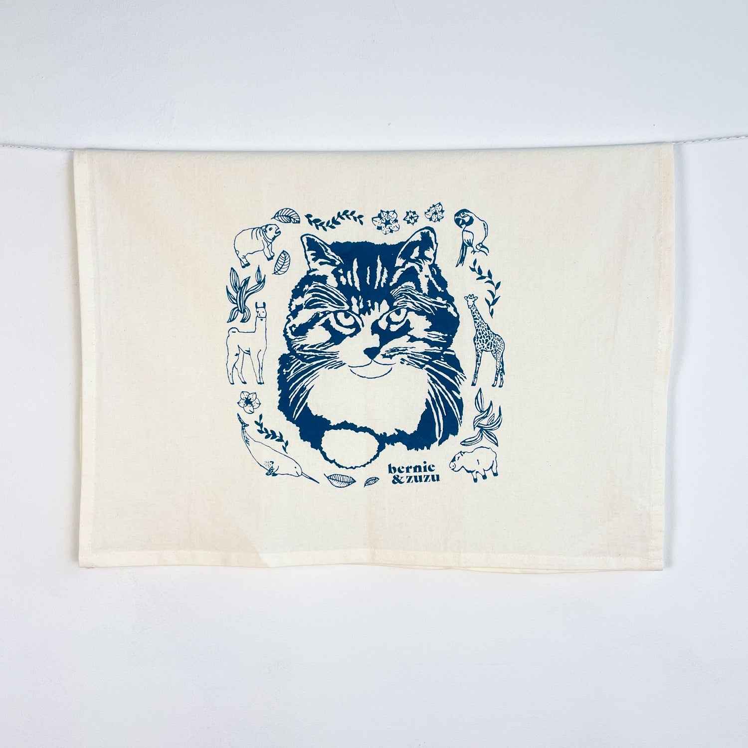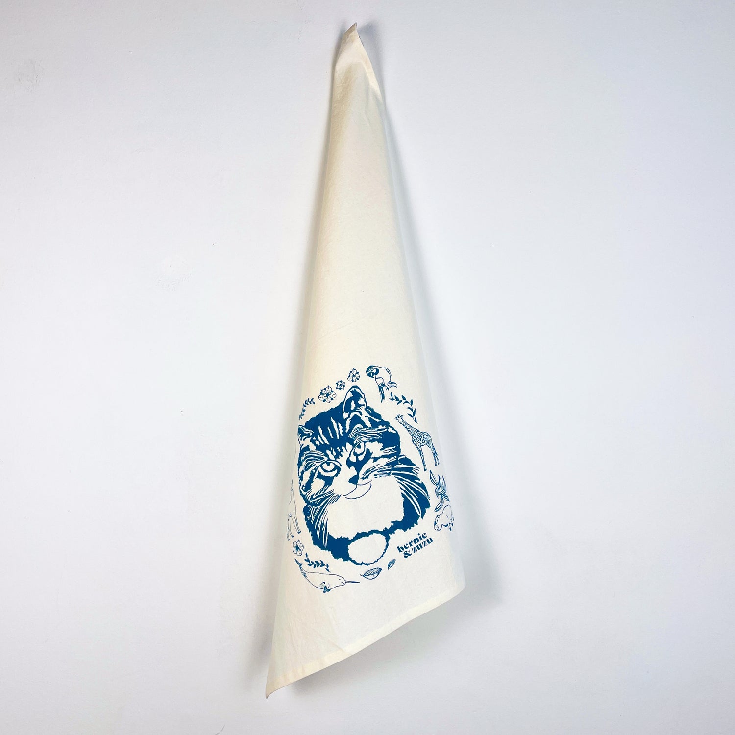 Our Cat and Friends Tea Towel features Zuzu the Cat surrounded by all her best friends! Her friends include the Moo Deng the Pygmy Hippopotamus, Penelope the Parrot, Jennie the Giraffe, Carrie the Capybara, Nancy the Narwhal, and Lolly the Llama!