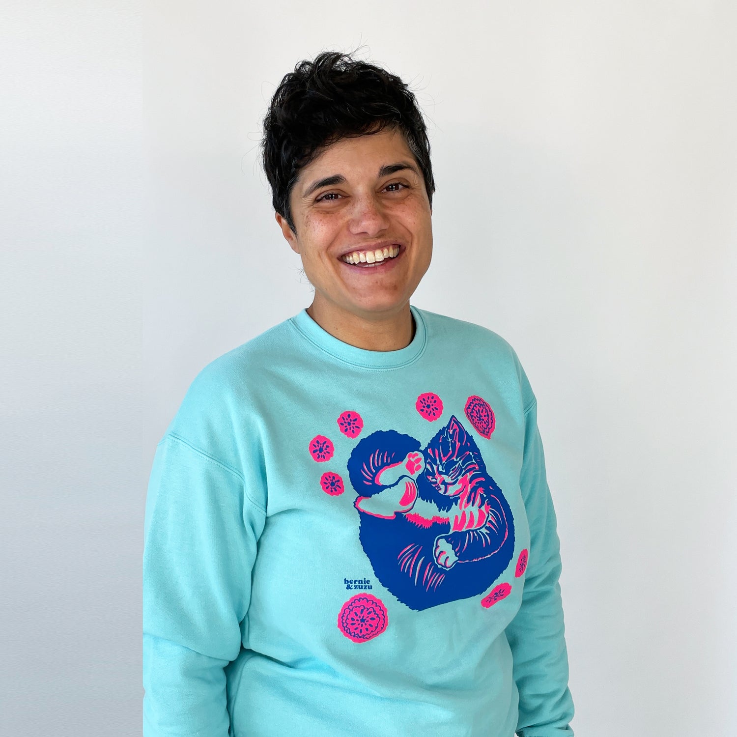 Zuzu the Cat when she was a kitten, all curled up & sleeping in the zinnias! This print is based on a photo of Zuzu as a baby sleeping in this exact pose. The design features hot pink and blue inks on a bright blue sweatshirt. Hand printed on soft sweatshirts made of 80% cotton and 20% poly fabric.