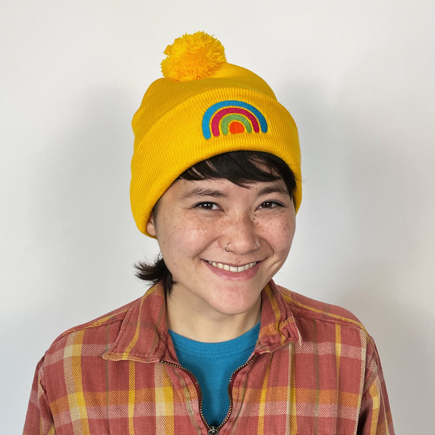 Keep your head warm with our classic rainbow beanie embroidered on a bright yellow hat with a big ole pom-pom on top! This beanie features our iconic rainbow made up of fun new colors - sky blue, magenta, spring green and orange. The hats are soft acrylic knit and measure 12", with an adjustable 3" cuff.