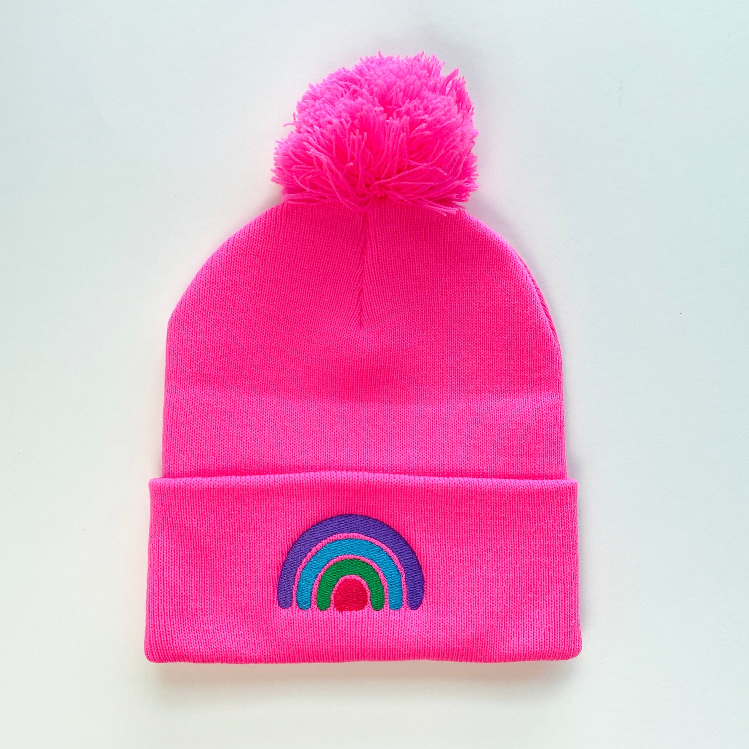Keep your head warm with our classic rainbow beanie embroidered on a hot pink hat with a big ole pom-pom on top! This beanie features our iconic rainbow made up of fun new colors - purple, light blue, green and magenta. The hats are soft acrylic knit and measure 12", with an adjustable 3" cuff.